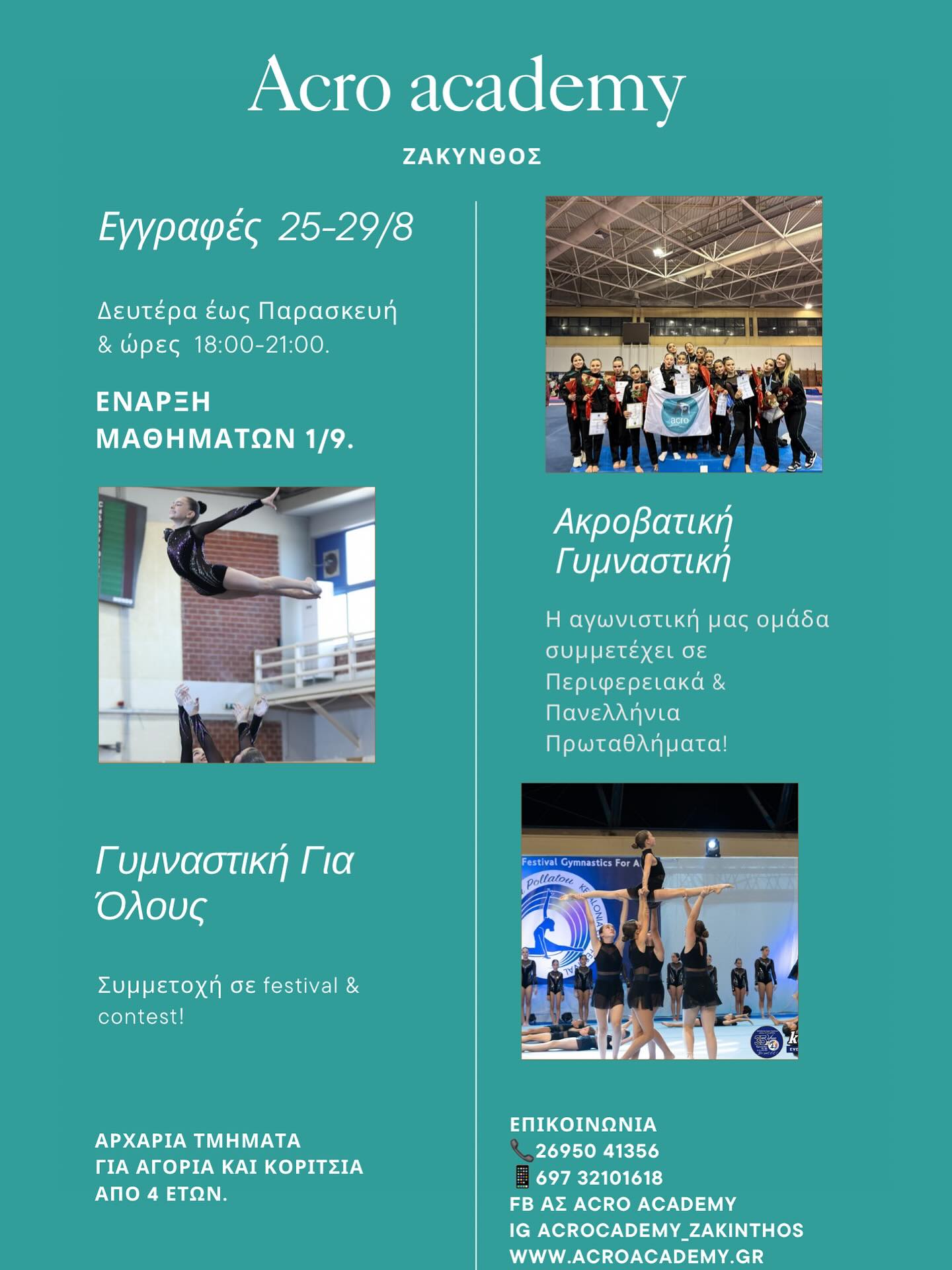 Από το 2018, η Acro Academy έχει αφιερωθεί στην εκπαίδευση και στην εξέλιξη της ακροβατικής γυμναστικής στη Ζάκυνθο. Εμπνέοντας αθλητές να εκφράσουν την αθλητική τους αριστεία και να ξεπερνούν τα όρια, η Acro Academy είναι η βάση για να οικοδομήσουμε όχι μόνο σπουδαίους αθλητές, αλλά και χαρακτήρες που ξεχωρίζουν.
